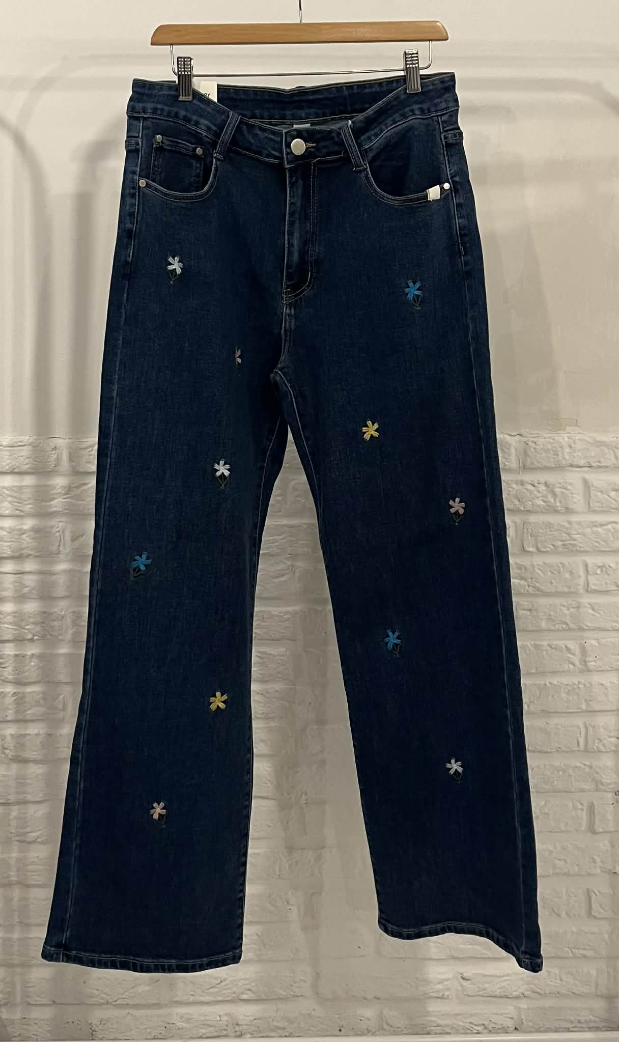 Détails du produit Jeans wide leg pour femme, brodé fleur, 5 poches coton et polyester, parfait pour le printemps/été. Composition: Coton (70%), Polyester (23%),Viscose (5%), Élasthanne (2%) Collection: Printemps/Été 2026