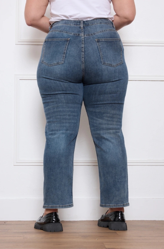 Jean droit confortable, taille haute, avec poches avant et arrière. Confectionné en denim, il présente des détails de surpiqûres et une coupe légèrement décontractée, idéal pour un style décontracté ou chic.