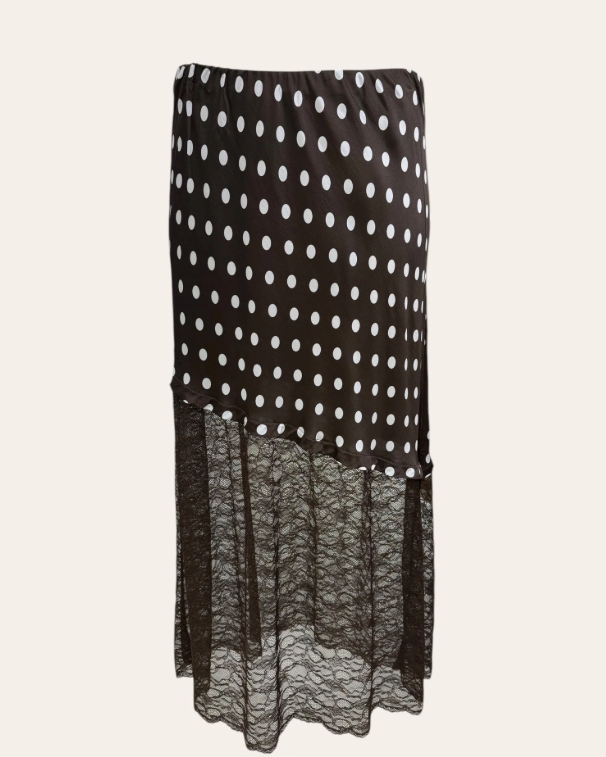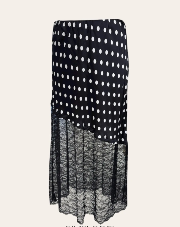 Jupe fluide avec un jeu de transparence. Détails en dentelle sur le bas et imprimé à pois sur l’ensemble. Taille élastique pour un confort optimal. Idéale pour un look élégant et décontracté, à associer avec des sandales ou des talons. TU= 44-50