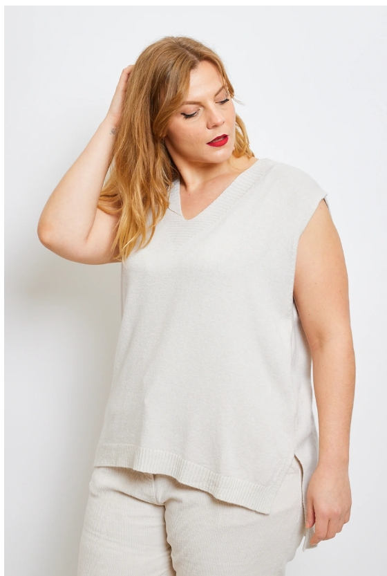 Débardeur féminin sans manches, col en V profond, finition en bord-côte. Idéal pour un look décontracté tout en restant élégant. Sa matière légère et douce en fait un essentiel du dressing.