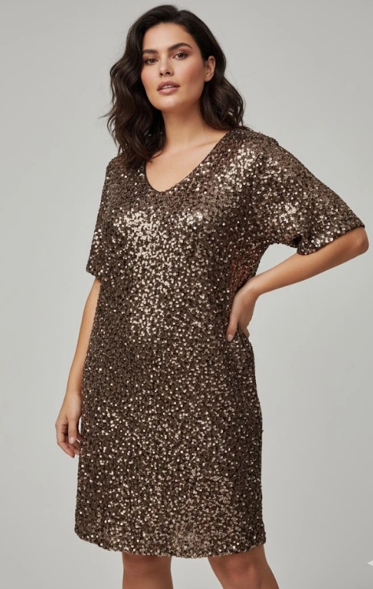 Détails du produit Robe élégante avec un décolleté en V et manches courtes. Parfaite pour les soirées, elle est ornée de sequins brillants. Sa coupe fluide et son tissu léger apportent confort et style, faisant de cette pièce un incontournable de votre garde-robe. TU = 42-46, Composition: Viscose (100%) Collection: Automne/Hiver 2025/2026