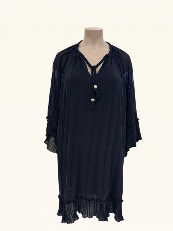 Détails du produit Cette robe légère arbore des manches évasées et un col en V. Son tissu plissé offre une allure élégante, tandis que les détails en fronces et les cordons rehaussent son charme. Idéale pour les sorties estivales ou décontractées. Composition: Viscose (100%) Collection: Automne/Hiver 2025/2026